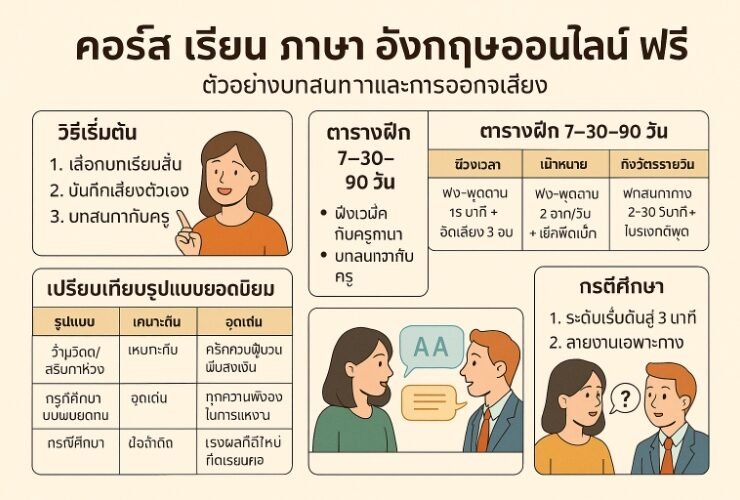 - สัปดาห์ 11–12: โครงสร้างประโยคพื้นฐาน, เขียนประโยคง่าย, พรีเซนต์สั้น 30–45 วินาที