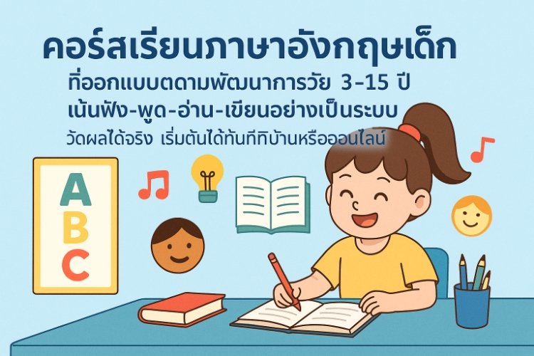 คอร์สเรียนภาษาอังกฤษเด็ก ที่ออกแบบตามพัฒนาการวัย 3–15 ปี เน้นฟัง–พูด–อ่าน–เขียนอย่างเป็นระบบ วัดผลได้จริง เริ่มต้นได้ทันทีที่บ้านหรือออนไลน์
