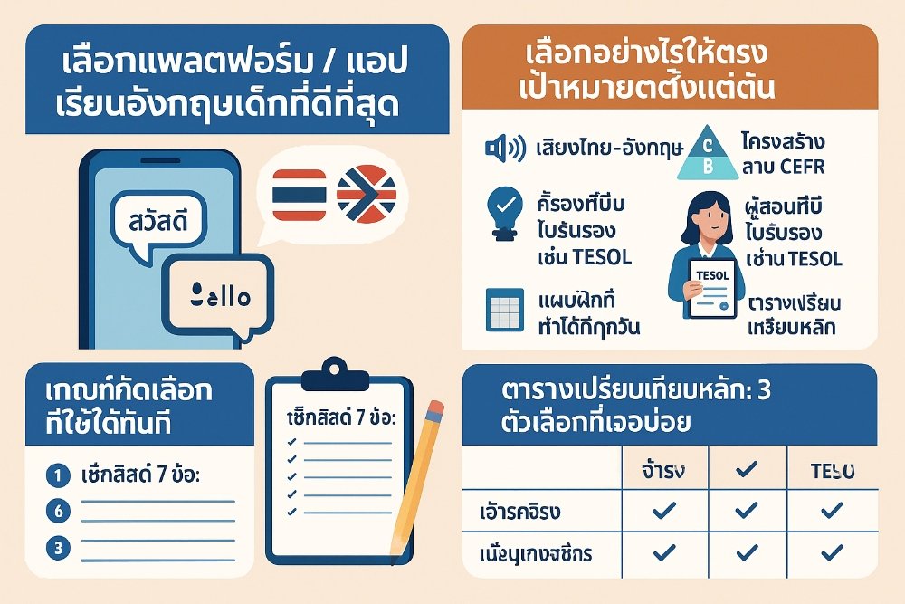 เป้าหมายของผู้ใช้ส่วนใหญ่คือ “เริ่มได้จริง รักษาวินัย และเห็นผลลัพธ์วัดได้” ดังนั้นการคัดเลือก แพลตฟอร์ม / แอป เรียนอังกฤษเด็กที่ดีที่สุด ควรเริ่มจากความต้องการหลัก: เสียงไทย–อังกฤษที่ชัดเจน, บทเรียนสั้นกระชับแบบโต้ตอบ, มีแบบฝึกก่อน–หลังเรียน, วัดระดับตามมาตรฐาน CEFR, และดูแลโดยผู้สอนที่มีใบรับรองด้านการสอนภาษาให้ผู้เรียนต่างชาติ เช่น TESOL